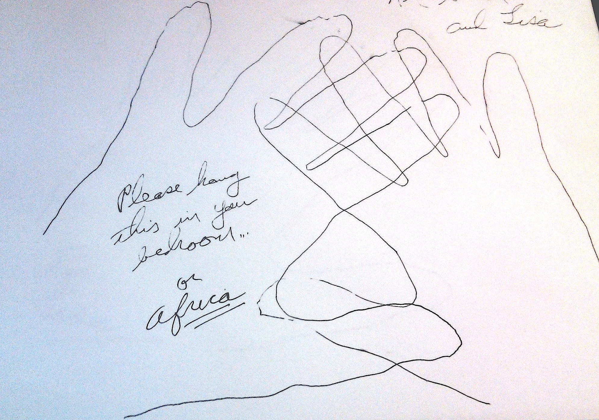 This becomes our daily ritual. As we walk down the street Husband points to something and has me tell him what’s funny about it. That fire hydrant, this umbrella, the street lamp over there; “Tell me what’s funny about it.” And over time it gets easier and easier. Suddenly I start noticing the funny in everything. I begin laughing alone on the subway, walking down the sidewalk, and by myself in my apartment. My days at work become about silliness. We make up games to pass the time. Husband, the four foot five inch maid, and I play trashcan basketball with crumpled up pieces of stories that he and I discard after writing. We take turns being the sportscaster shouting through a paper megaphone. Husband always wins. We draw pictures, his favorite being the outline of our hands that he titles, “The Hand Affair.” He sings “I feel pretty,” as I dance around the living room while breaking in Wife’s new ballerina flats that are “just a tiny bit too tight.” Husband knows how to make every degrading task humorous. When Wife walks in I run to my seat pretending to type while Husband puts the New York Times in front of his face, both of us trying not to chuckle.